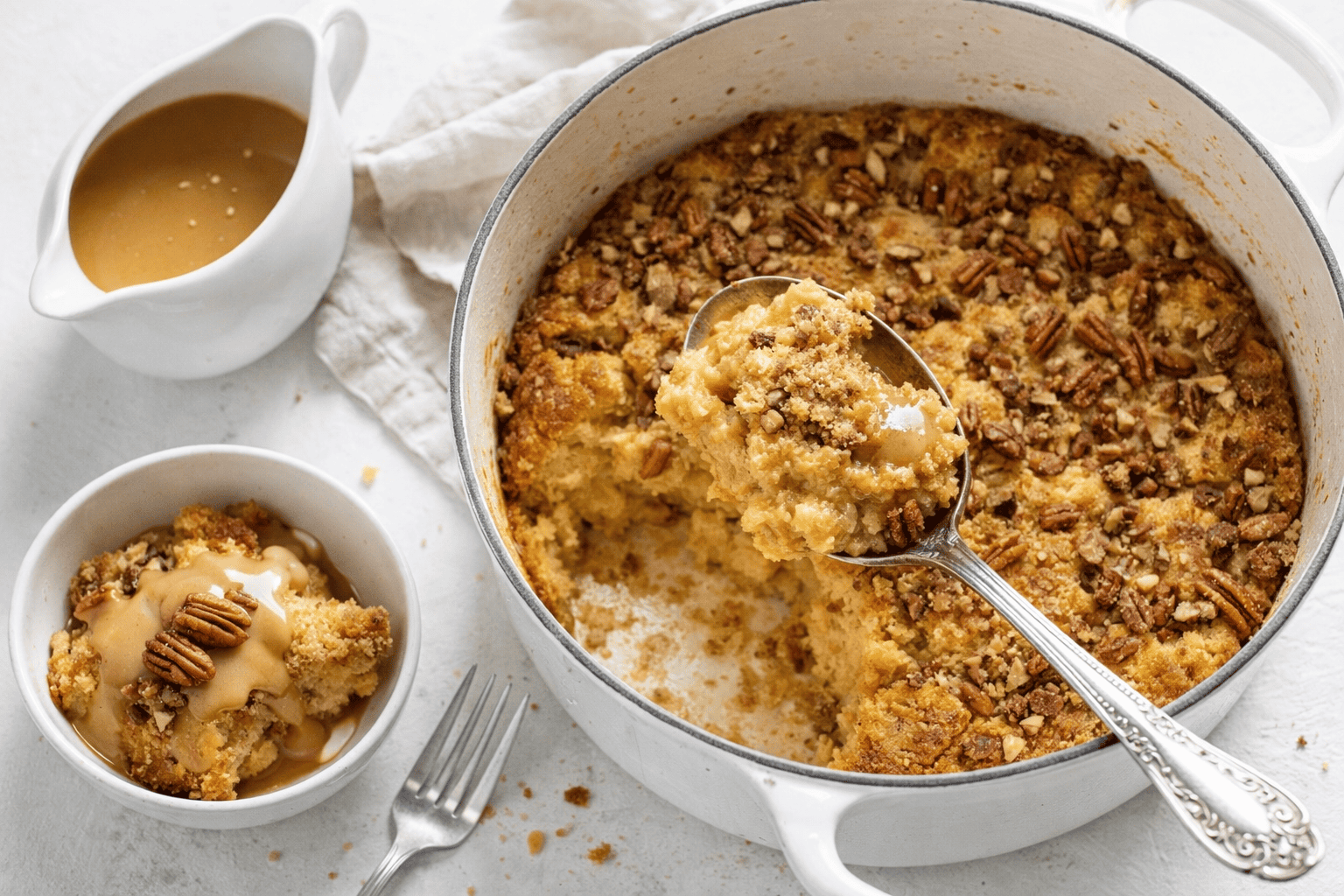 A rich and comforting dessert featuring custard-soaked challah, toasted pecans, and a hint of bourbon, all baked to perfection in a Dutch oven.