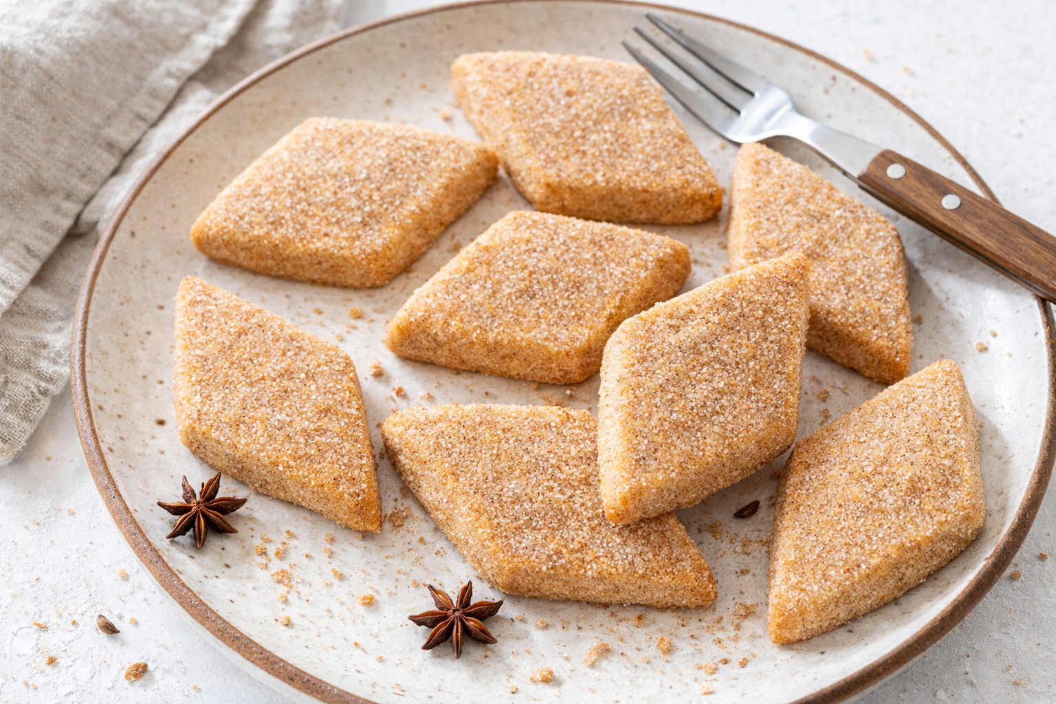 These crisp, diamond-shaped cookies are infused with the warm, aromatic flavors of cinnamon and anise, then rolled in a sweet cinnamon sugar coating.