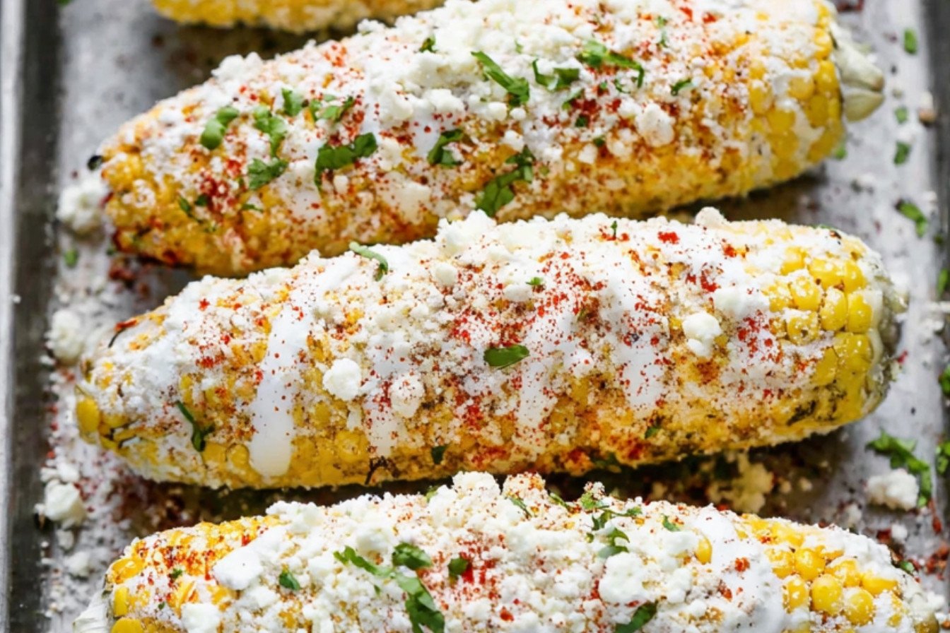 A classic Mexican street food favorite, featuring grilled corn slathered in a creamy sauce, tangy cheese, and a sprinkle of chili powder.