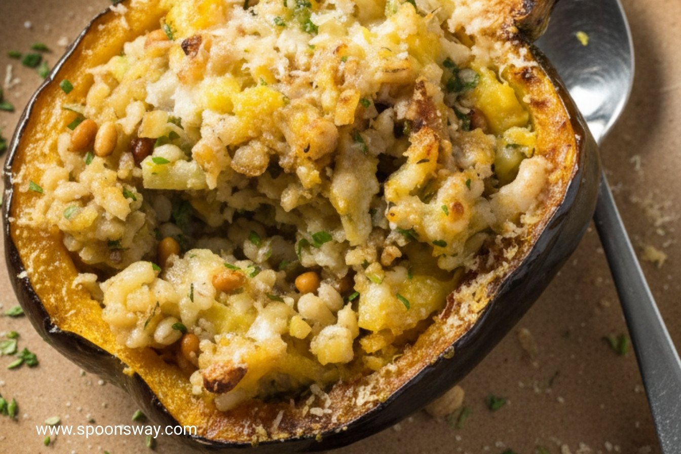 A hearty and flavorful vegetarian main featuring roasted acorn squash stuffed with a savory pearl barley, fennel, and Parmesan filling.