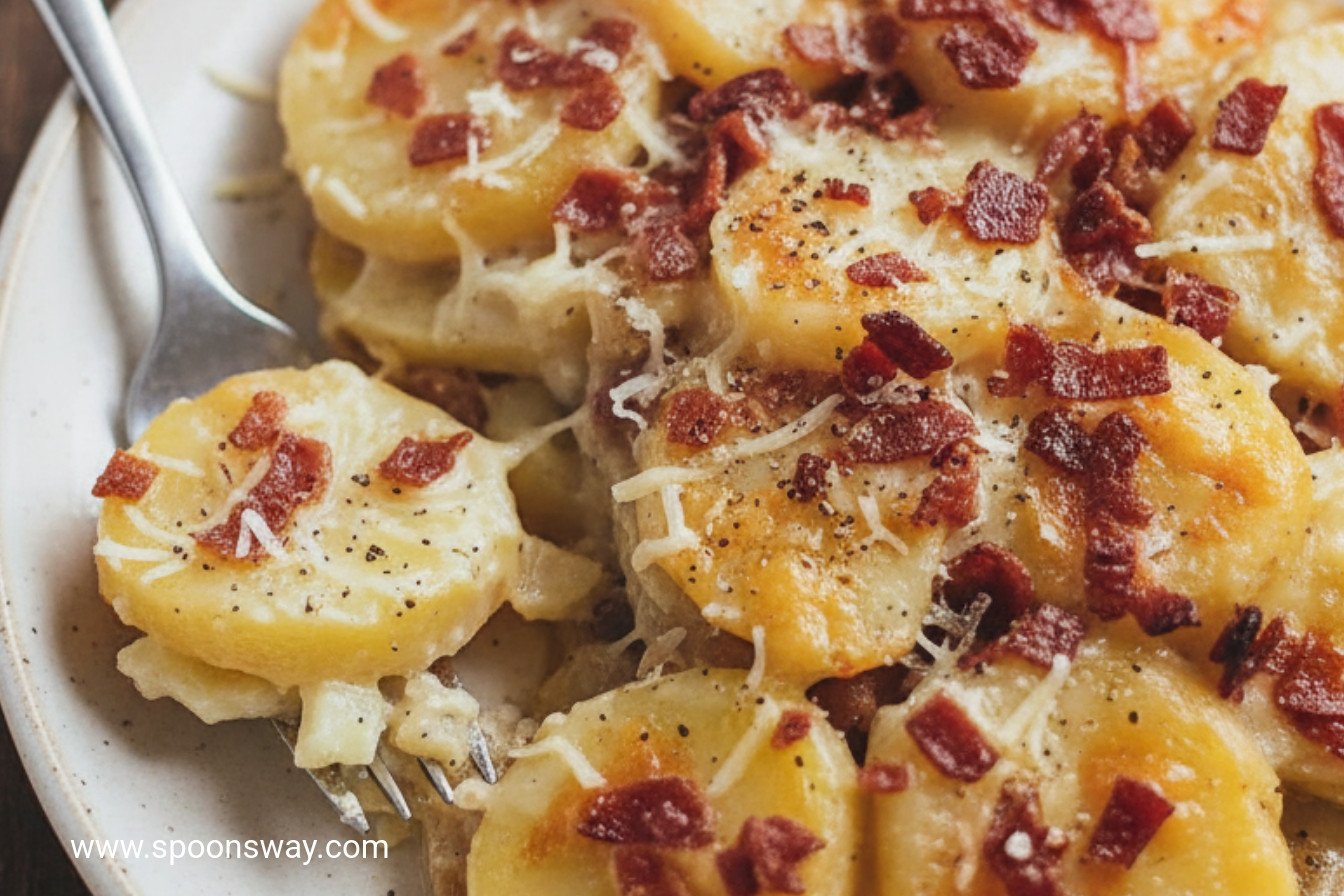 A rich and savory layered casserole featuring tender potatoes, caramelized onions, crispy bacon, and melted Gruyère cheese.