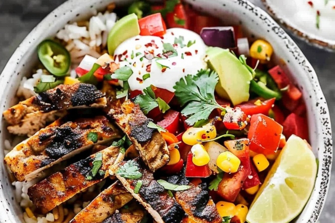 A vibrant and flavorful meal featuring marinated chicken, sautéed peppers and onions, cilantro-lime rice, and a zesty chipotle crema.