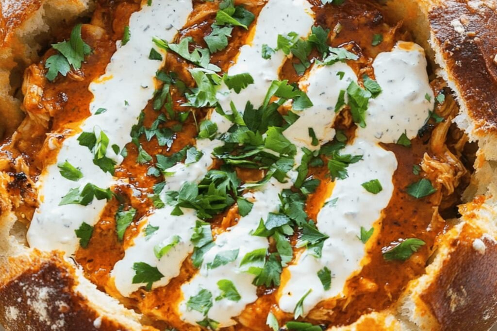 Combine shredded chicken, buffalo sauce, ranch, cheeses, garlic, and veggies in a bowl. Stir until everything is creamy and well-coated. Let it sit while you prep the bread bowl. This helps the flavors blend.