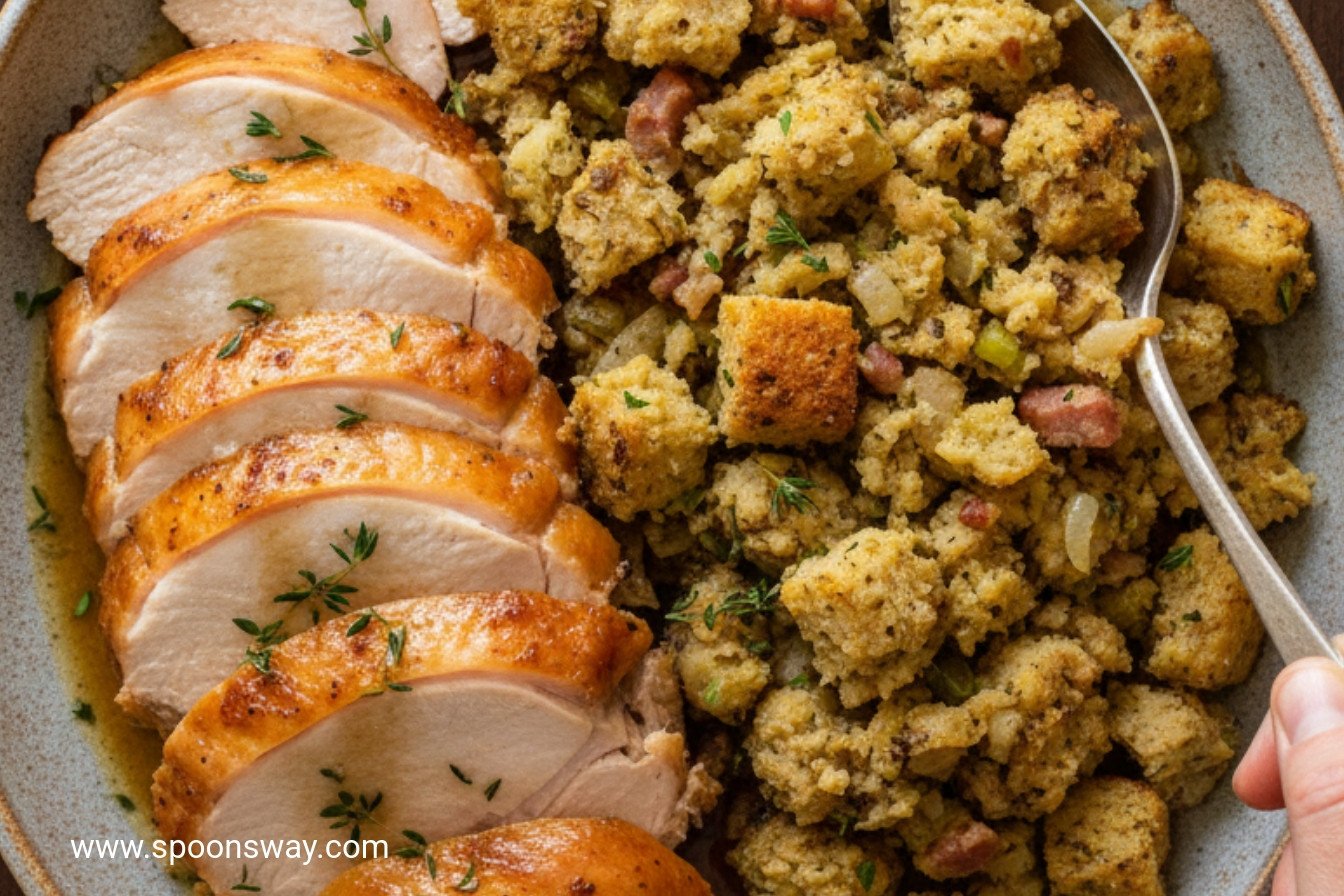 Step 1: Dry your bread cubes in a low oven. This is key for good stuffing. It gives them a wonderful texture. While they dry, cook your onion and celery in butter. Oh, that smell is amazing! It fills the whole kitchen. Stir in the fresh herbs last. Their fragrance is just lovely. Toss it all with a little broth. Step 2: Now, prepare your turkey. Dry the skin very well with paper towels. This helps it get crispy later. A little trick: mix salt with baking powder. Rub it all over the skin. It makes the skin golden and crackly. Tuck the wings under neatly. What’s your favorite part of the turkey? The leg or the breast? Share below! Step 3: Line the cavity with cheesecloth. Pack in about 4 cups of your stuffing. Tie it up like a little bundle. This keeps everything tidy and moist. Tie the legs together loosely. Place the turkey breast-side *down* in the pan. I know, it seems odd! Drape slices of rinsed salt pork over the back. Step 4: Roast it low and slow, breast-down. This keeps the white meat incredibly juicy. After a couple hours, take it out. Carefully flip it breast-side up. Isn’t that color beautiful already? Remove the stuffing bundle and the salt pork. Turn your oven up nice and hot. Step 5: Roast the turkey again until golden and cooked through. Let it rest on a cutting board. This is so important! It lets the juices settle. Meanwhile, finish your stuffing. Mix the rest with eggs and broth. Bake it in a dish until puffy and golden. The wait will make you so hungry. Cook Time: 3–4 hoursTotal Time: 24–48 hours (includes brining)