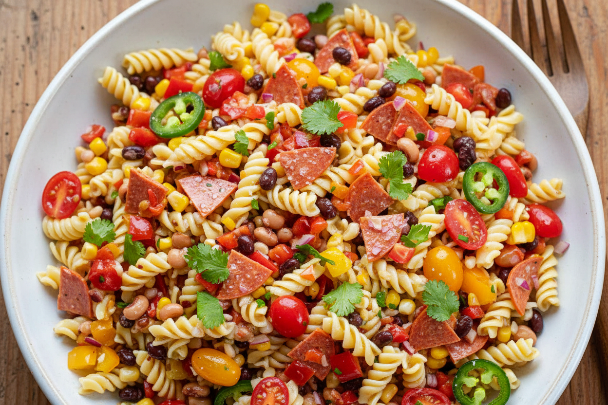 A hearty, colorful, and flavorful pasta salad packed with pepperoni, beans, corn, and fresh vegetables, all tossed in a zesty Italian vinaigrette.