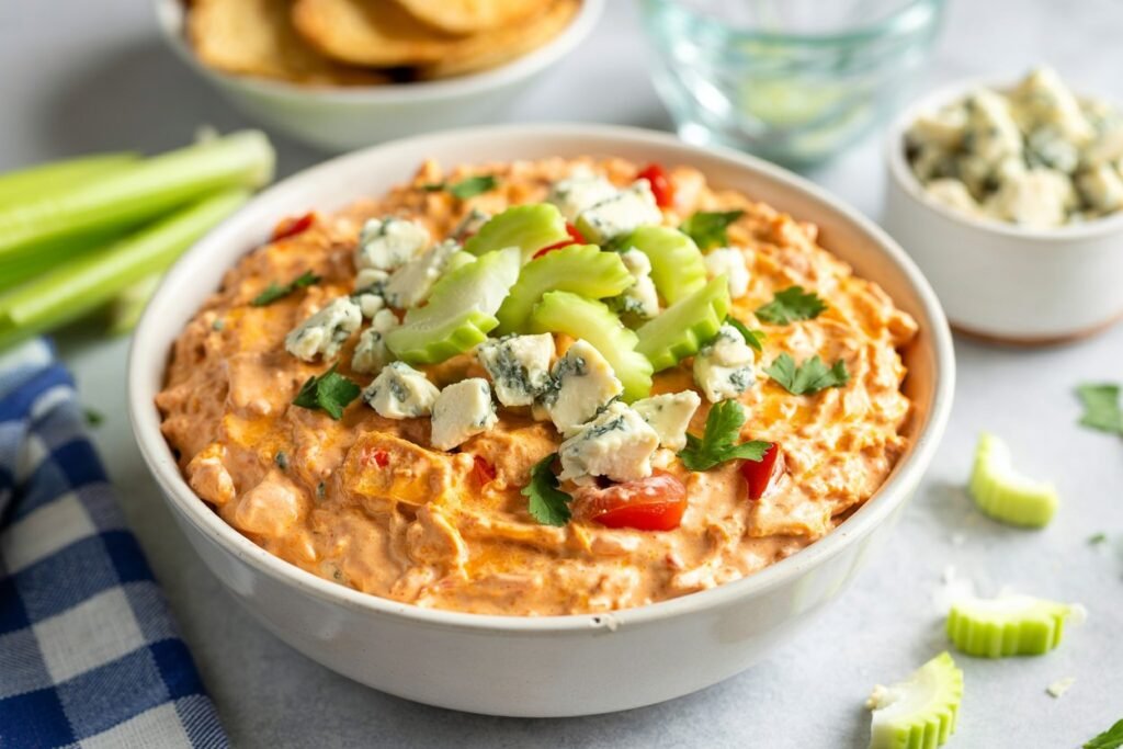- Top with blue cheese crumbles and serve with celery sticks on the side for that extra crunch.