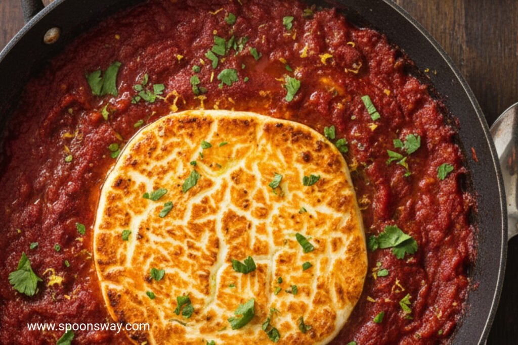 A warm, flavorful dip featuring a spiced tomato sauce with a creamy, broiled goat cheese disk at its center.