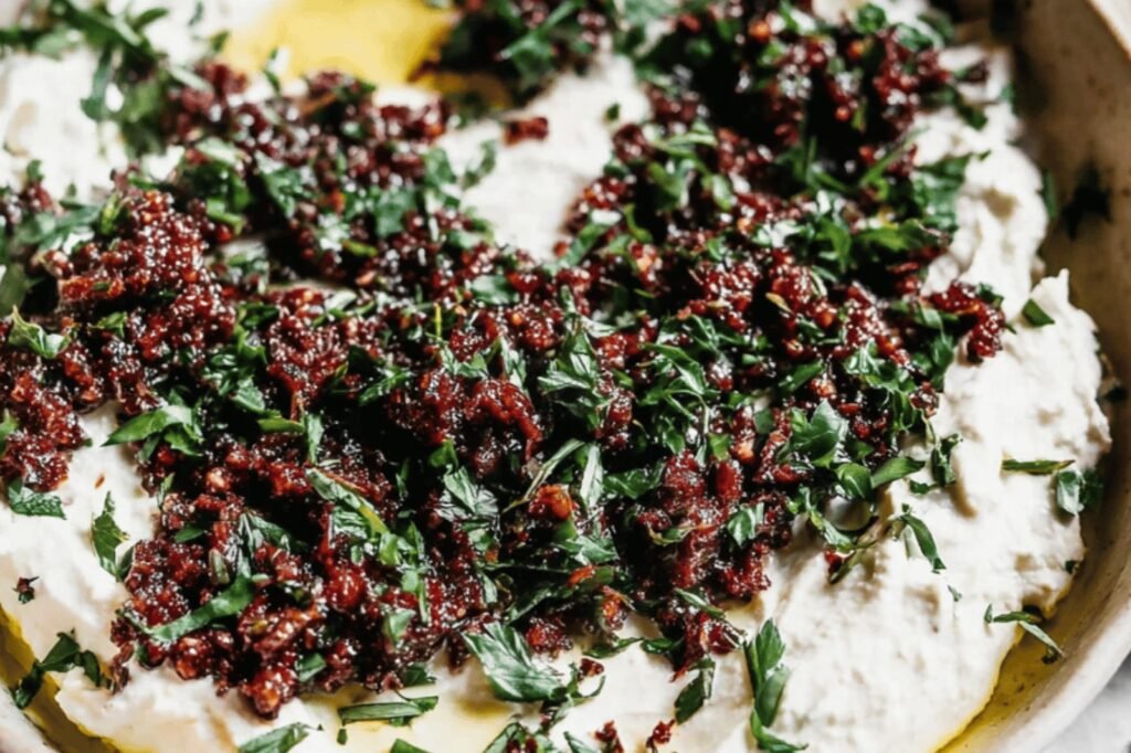 A creamy and flavorful goat cheese dip with sun-dried tomatoes, olives, and fresh herbs. Perfect for dipping with bread or crackers.