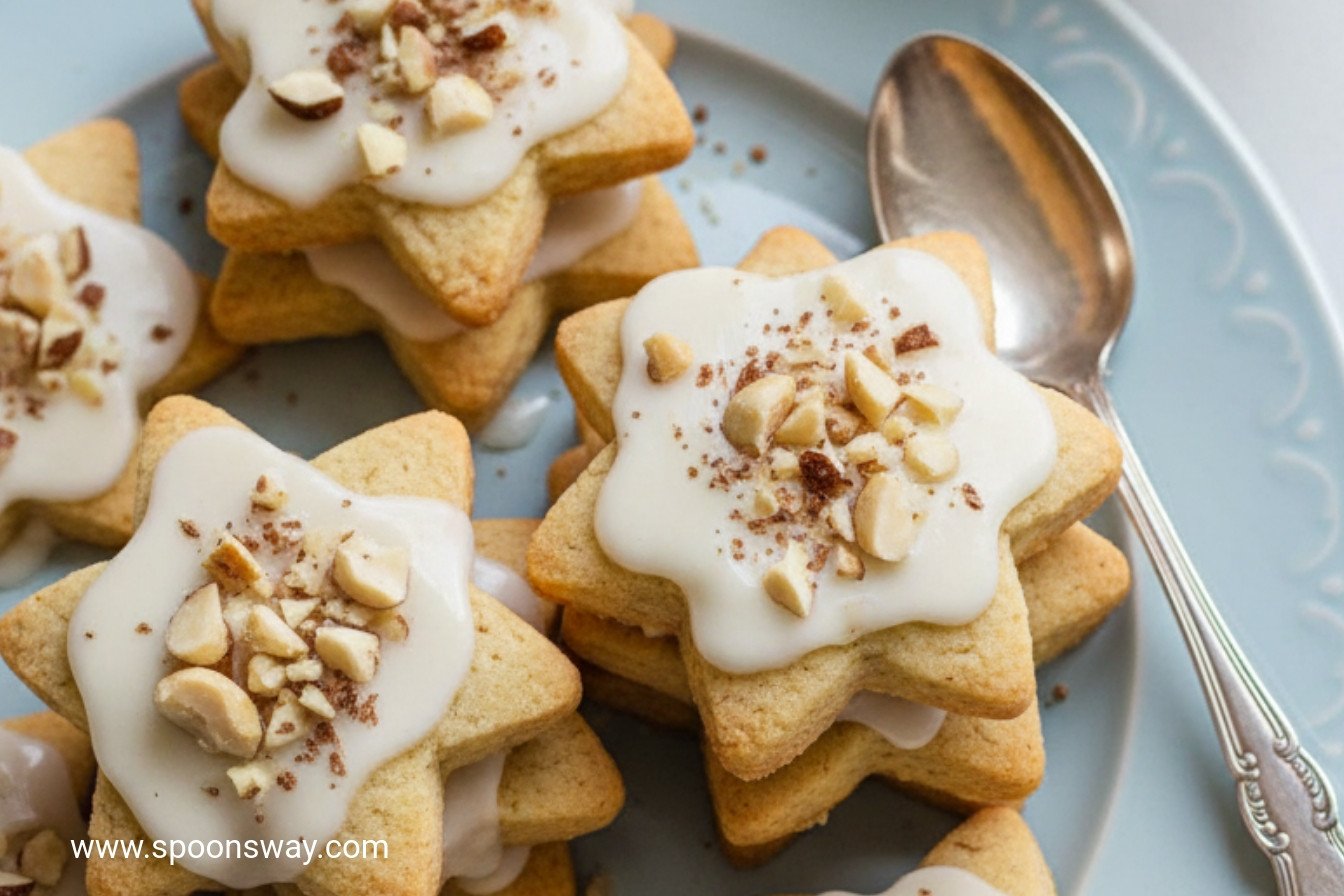 These are thin, star-shaped cookies. They have a sweet eggnog glaze. Toasty macadamia nuts sit on top. Every bite is creamy and crunchy. I still smile when I make them.