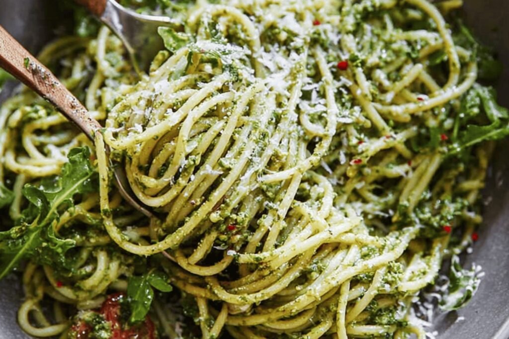 A vibrant and creamy pesto pasta loaded with fresh basil, pine nuts, and parmesan, tossed with cherry tomatoes and arugula.