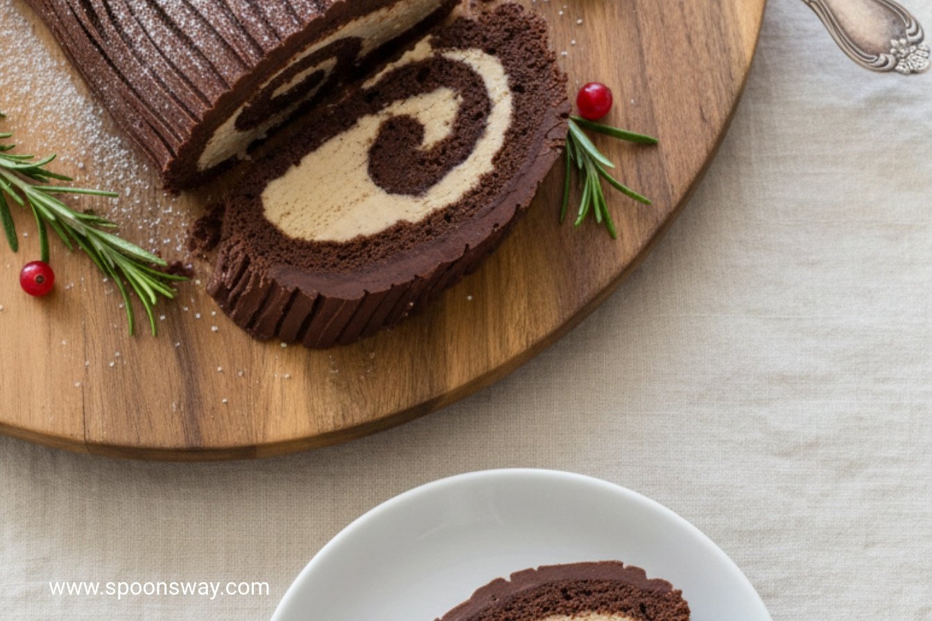 Keywords:Chocolate Roulade, Yule Log, Holiday Dessert, Chocolate Cake, Mascarpone