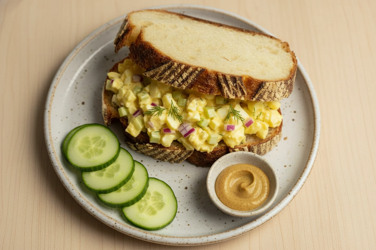 • Step 5: Finally, the fun part. Get your sourdough bread. It’s my favorite for its tangy taste. Divide the chilled egg salad between three slices. Then top with the other slices. Press down gently. Now you have a perfect lunch. Cut it in half if you like. I always do.