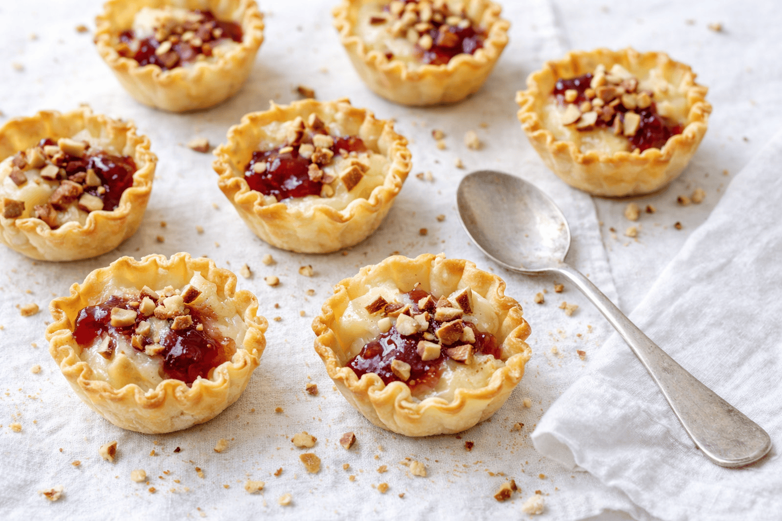 Individual Baked Brie Pastries are an elegant and easy appetizer, featuring creamy Brie, sweet jelly, and crunchy almonds in crispy filo cups.