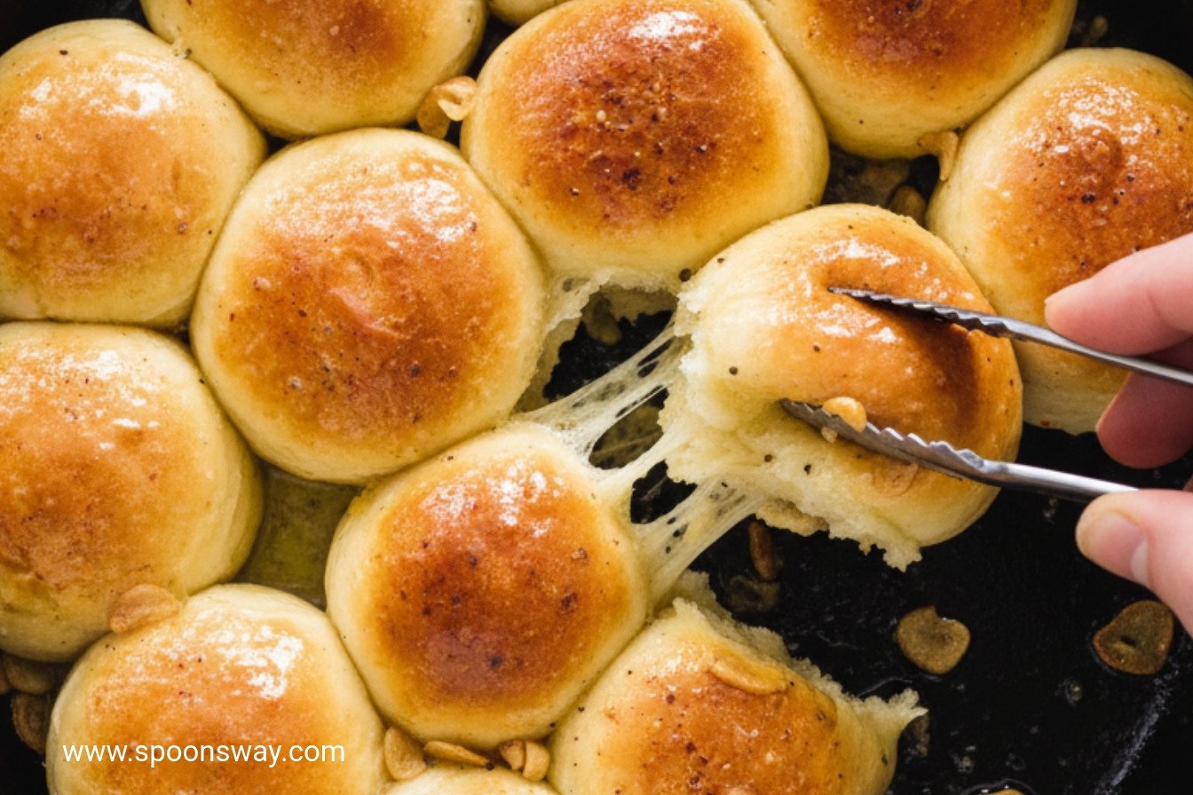 Warm, fluffy pull-apart rolls baked in a cast iron skillet, infused with rich, aromatic garlic butter for a savory side dish.