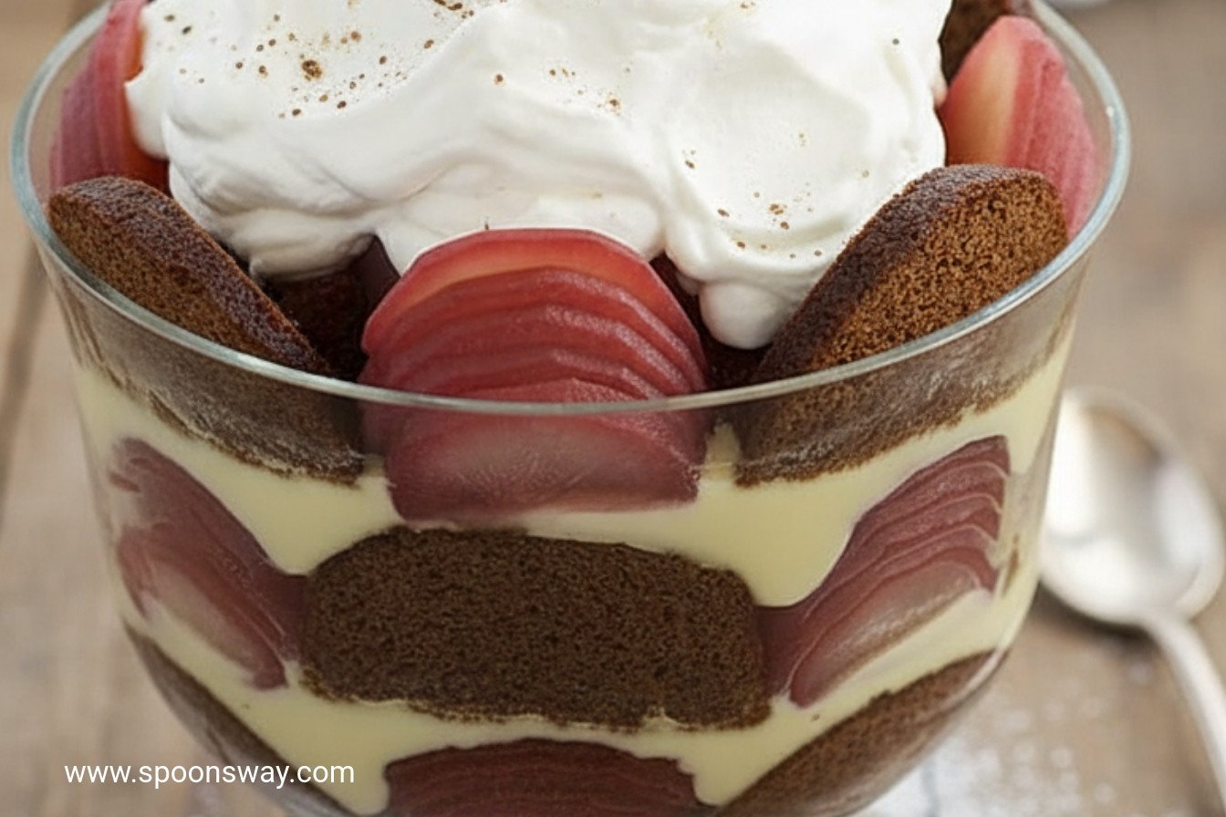 A stunning and festive layered dessert featuring spiced gingerbread, wine-poached pears, creamy custard, and whipped cream.
