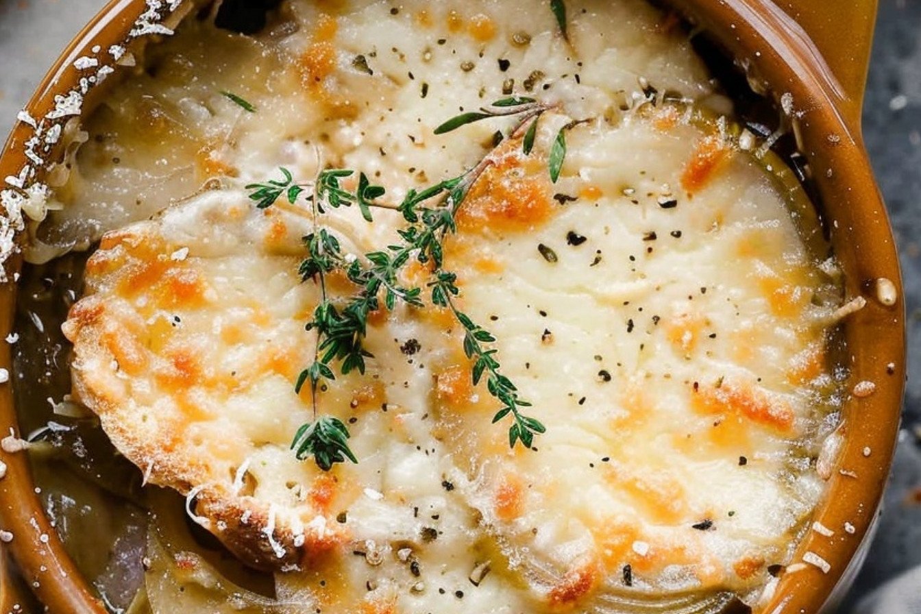 A rich and comforting classic, this homemade French Onion Soup features deeply caramelized onions in a savory beef broth, topped with cheesy garlic toast.