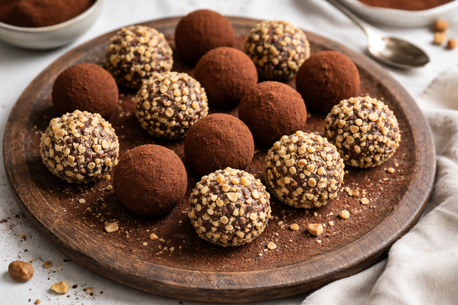 Indulge in rich, melt-in-your-mouth chocolate truffles with a decadent hazelnut-mocha ganache center, coated in cocoa and chopped hazelnuts.