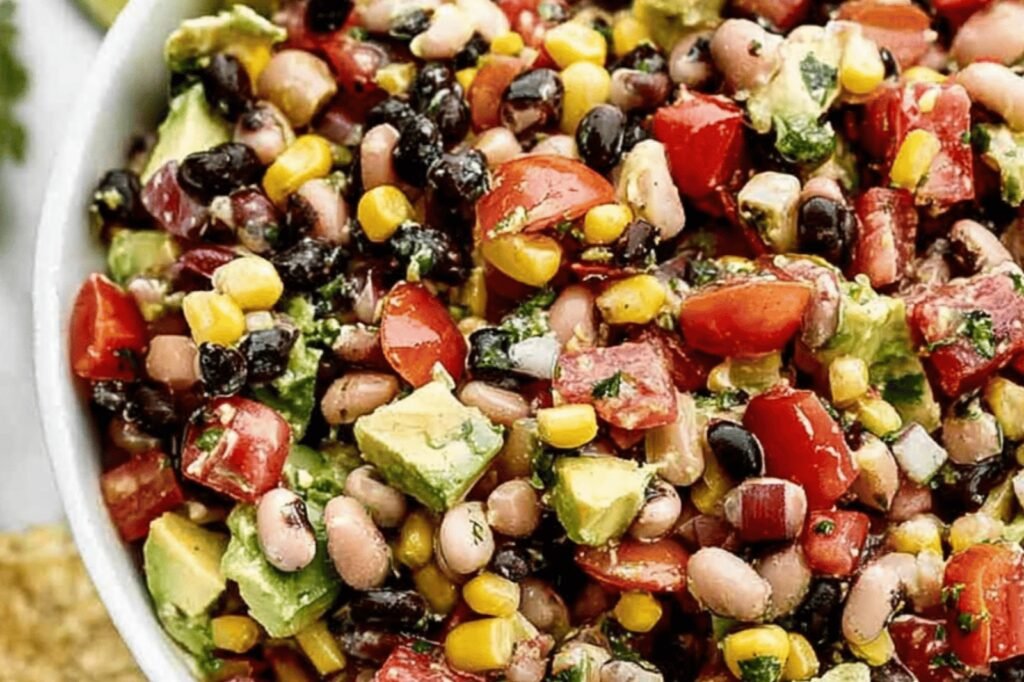 A fresh and vibrant bean salad packed with black beans, pinto beans, corn, tomatoes, avocado, and cilantro, perfect for gatherings.