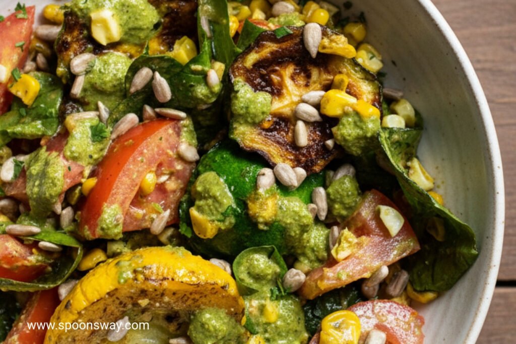 A vibrant summer salad featuring roasted pattypan squash and sweet corn, tossed with fresh tomatoes and dandelion greens in a creamy, nutty dressing.