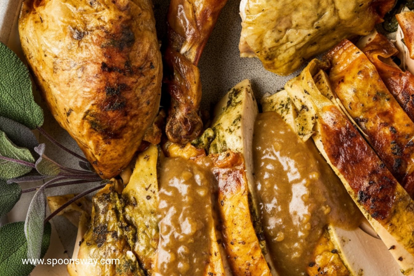 Aromatic and flavorful roast turkey with a unique sage and fenugreek herb paste, served with a rich, homemade gravy.