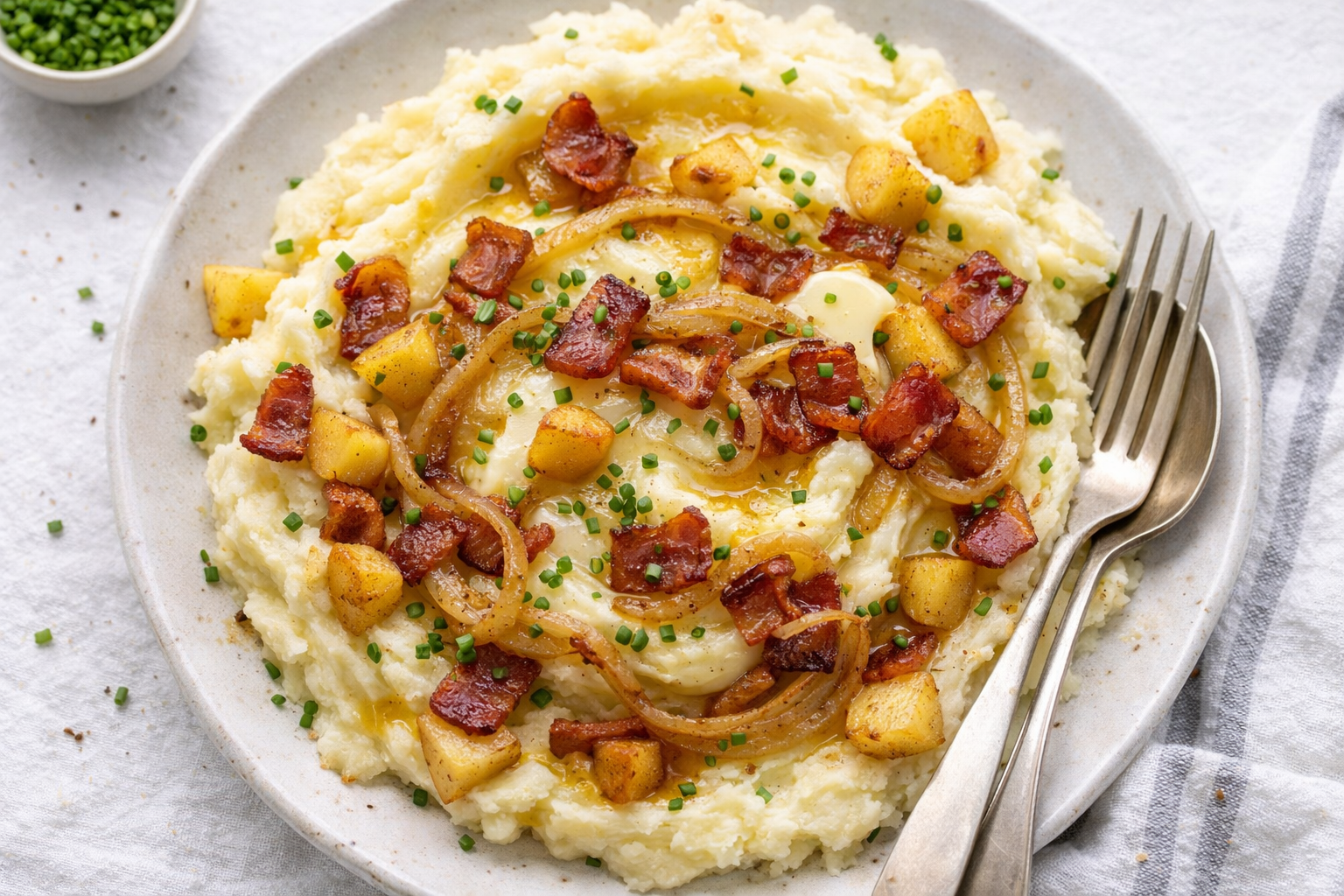 Spoon your fluffy mash into a bowl. Now, take those glorious browned onions and scatter them on top. Next, the crispy bacon crumbles. The final dish is a beautiful mess. You get creamy, sweet, salty, and crunchy in every forkful.