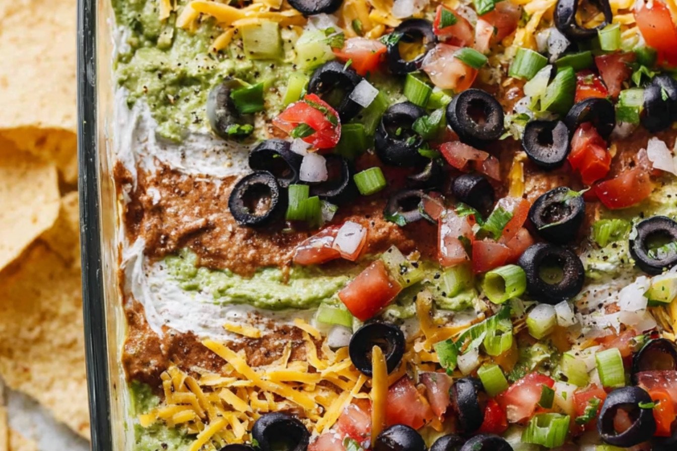 A vibrant and delicious layered dip featuring seasoned refried beans, creamy avocado, tangy sour cream, salsa, cheese, and olives. Perfect for parties and gatherings.