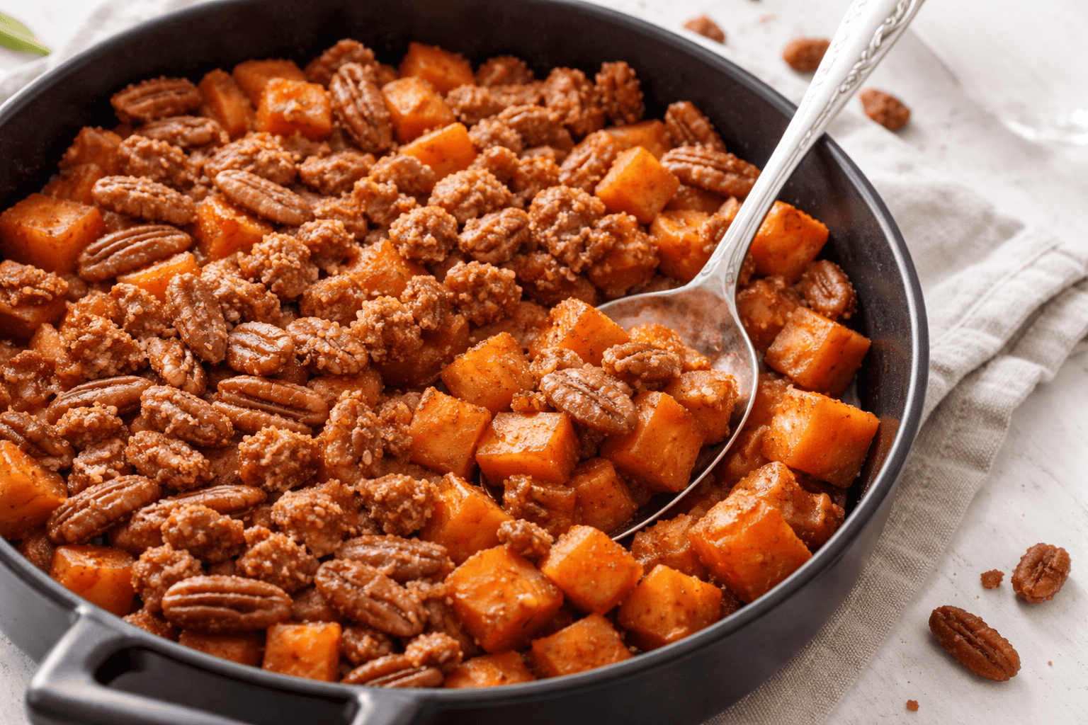 A classic holiday side dish featuring tender, candied sweet potatoes topped with a sweet, spicy, and crunchy pecan streusel.