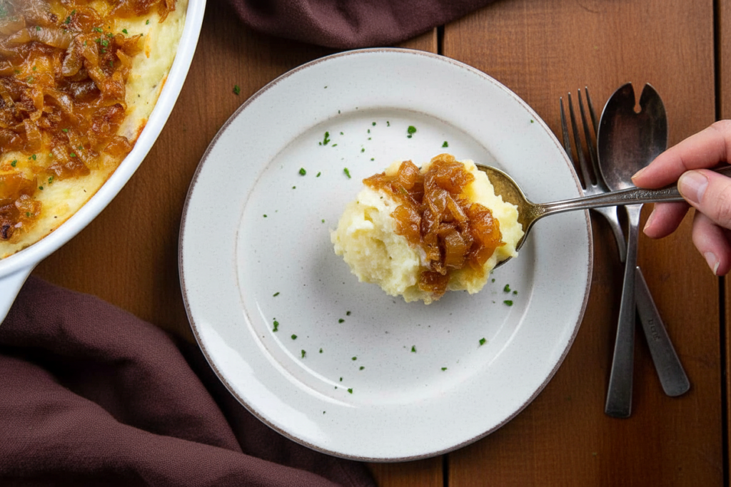 Creamy mashed potatoes are elevated with rich, slow-caramelized onions and nutty Gruyère cheese, then baked to golden perfection.