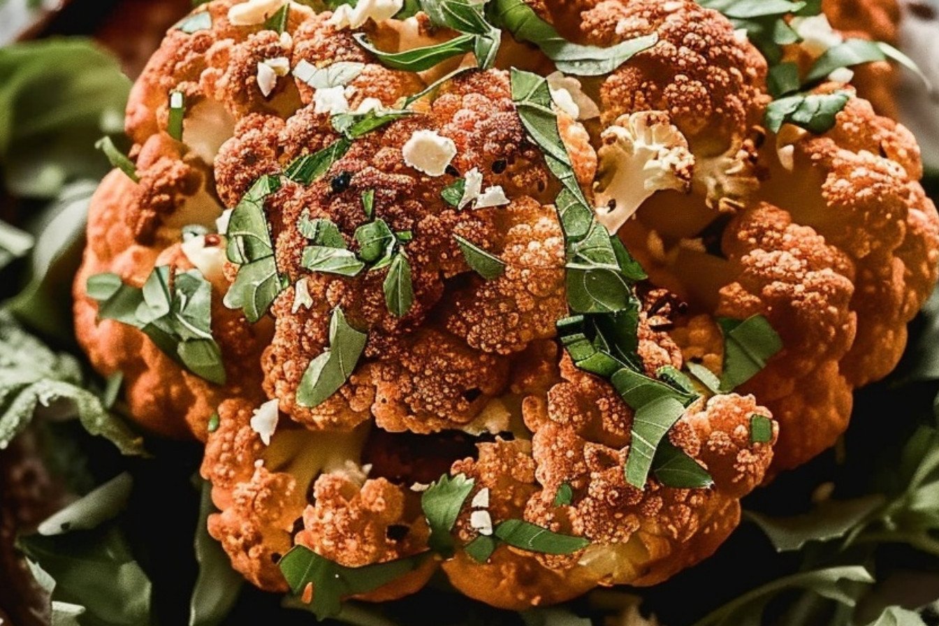 A stunning and flavorful whole roasted cauliflower, seasoned with garlic, paprika, and cumin, then drizzled with a creamy tahini sauce.